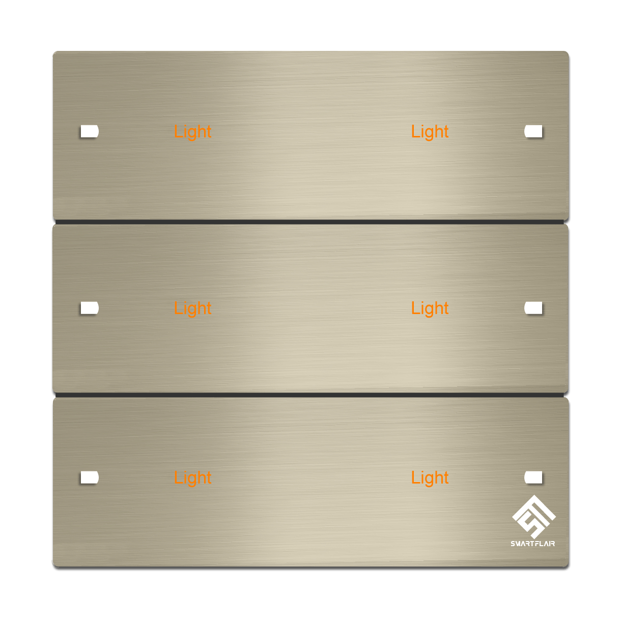 6gang touch smart switch features a sleek and elegant design with a champagne gold color and brushed stainless steel panel. This Smart touch light switch is easy to install in standard wall boxes and offers six-gang control for managing multiple lights or appliances. With wireless connectivity, you can control it remotely using your smartphone or voice commands. It has a maximum resistive load of 1-Way/Total way ≤ 1000W and a maximum current rating of 10A. The smart touch light switch combines style, functionality, and convenience for a modern and sophisticated home or office.