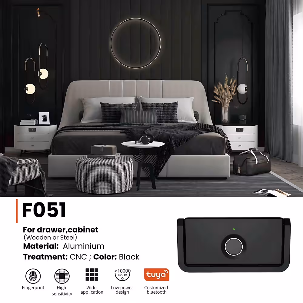 Equipped with high-sensitivity fingerprint recognition, the F051 provides instant and secure access without the need for keys. With Tuya Bluetooth connectivity, users can easily manage access through a mobile app for added convenience. Its low power consumption design ensures long battery life, making it ideal for continuous daily use. Perfect for both wooden and steel cabinets, this smart lock delivers security, style, and smart functionality in one compact device.