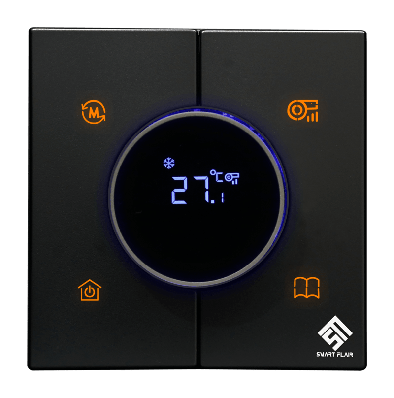 The smart knob thermostat switch is a stylish and high-performing home automation device. Its pearlescent matte black finish and brushed aluminum button panel add elegance and durability. The smart knob thermostat switch offers cooling, heating, and air modes, along with adjustable airflow settings. Controlling the switch is intuitive with its plastic KNOB ring and 1-18 gear system. Installation is easy with standard 86 wall box installation, and multiple panel connectivity ensures consistent temperature control. The temperature controller smart switch supports both 2 Pipe and 4 Pipe installations and meets UK and European standards. It combines sleek design and advanced features to provide precise temperature control and enhance your home’s ambiance.