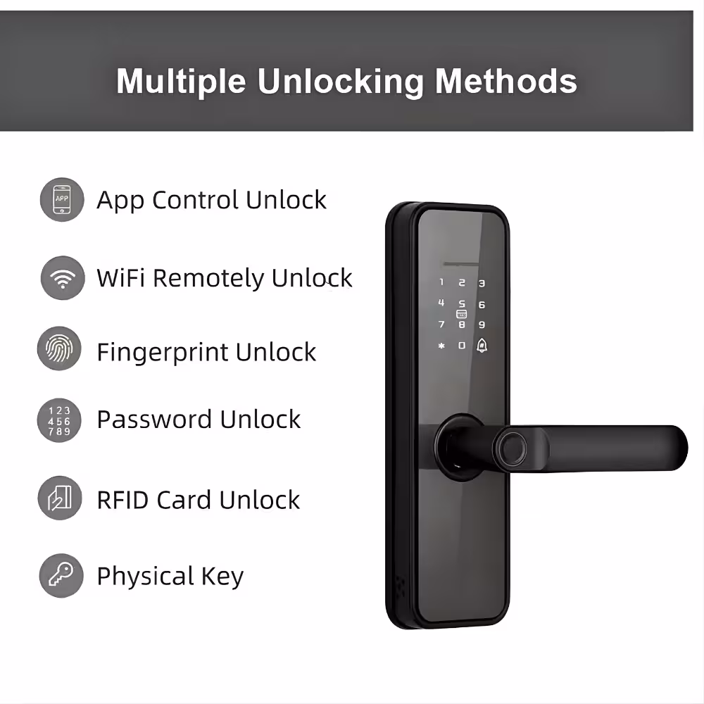 The Smart Door Lock with WiFi Fingerprint PIN & RFID Access is a versatile and secure solution designed for modern homes, offices, and commercial environments. With multiple unlocking methods, this smart lock provides convenience, flexibility, and enhanced security for everyday access control.