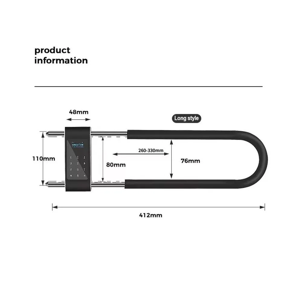 Constructed from high-quality aluminium alloy and designed with a slim profile of 420x110x20 mm, this U-shaped lock is not only stylish but also built to withstand various environmental conditions. Its IP66 rating ensures that it is waterproof, making it suitable for outdoor use.